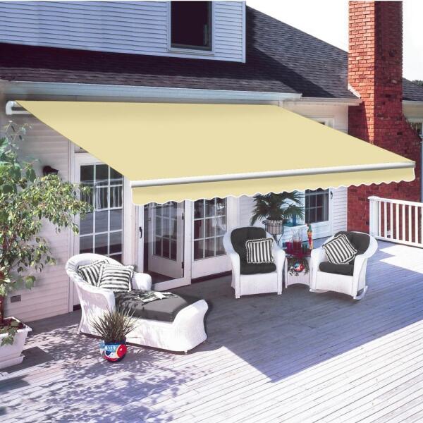 Színe: sárga és fehér Anyaga: PU-val bevont szövet és acélváz Szélessége: 400 cm Teljes árnyékolás: 120 cm Rugalmasan állítható magasság: 200-300 cm Támaszrúd átmérője: 16 mm Kezelőkar hossza: 125 cm Manuális működtetés Vízlepergető és kosztaszító Magas fényállóság Könnyen összeszerelhető Anyag : Poliészter: 100%