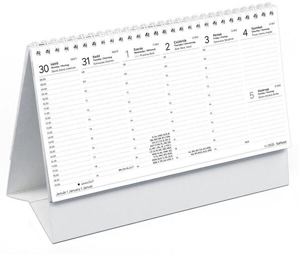 Papírtáblás, fehér tömbös, álló asztali naptár. Szitázással emblémázható.