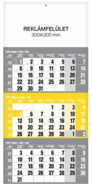 1 tömbből álló 3 havi speditőr falinaptár sárga fejlappal. Naptár teljes mérete: 300 x 680 mm