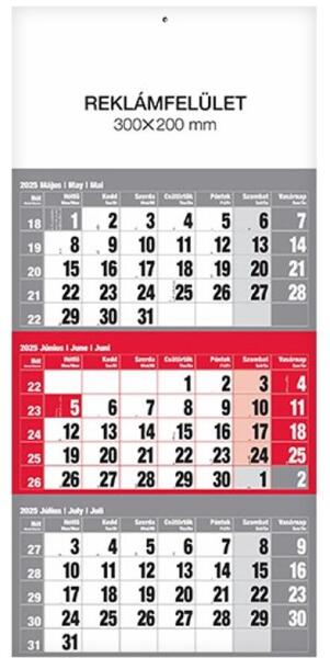 1 tömbből álló 3 havi speditőr falinaptár piros fejlappal. Naptár teljes mérete: 300 x 680 mm