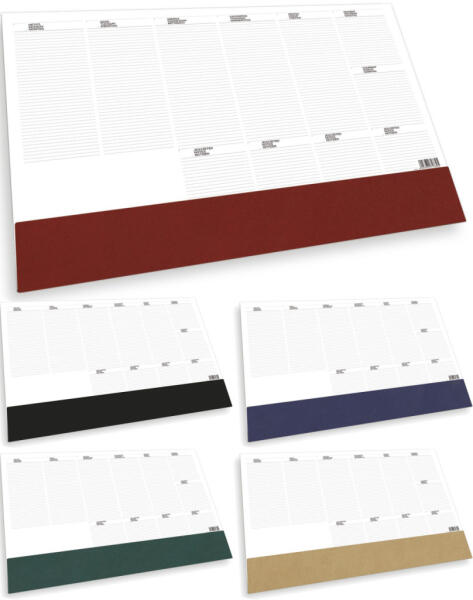 Könyöklő Fehér tömb, 26 letéphető lap, bianco heti tervező, a klapni hátulján éves összesítő naptár Tömbméret: 576 x 407 mm A "Választható színek"-re kattintva tudsz színt választani.