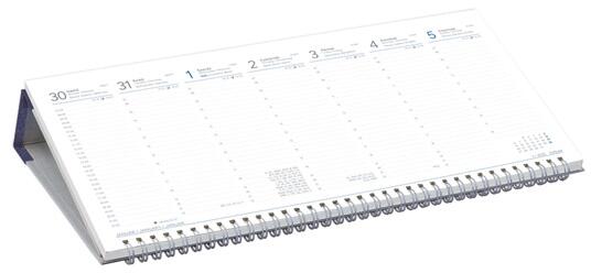 Műbőr táblával készült, fehér tömbös, fekvő asztali naptár. Szitázással, présfólia- és vaknyomással emblémázható. Naptárbeosztás: 6-22 óráig, 8-18 óráig félórás beosztással. Reklámfelület: 330x50 mm.