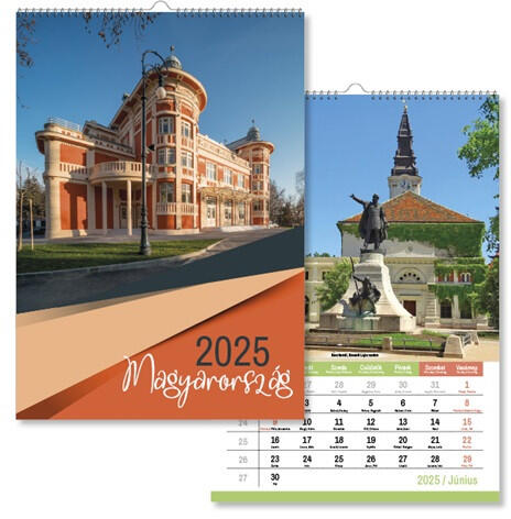 Naptár fali pd Magyarország 30x42 cm 2025 Formátum: álló Méret: 30×42 cm Terjedelem: 13 lap Papír: 150 g/m2 matt műnyomó Nyomás: 4+0 szín Kötészet: spirálozott, akasztóval, egyenként csomagolva