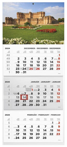 Kalendart 2025 T074 3 tömb Kastély speditőrnaptár A speditőr falinaptárak a fejrészben standard képpel vagy fehér nyomatlan fejkartonnal kerülnek forgalomba. A naptárháló 3 nyelvű, magyar és nemzetközi ünnepek jelölésével, 3 hónapos, háromtömbös kialakítással, csúszkával. Egyediesítés: az ajánlott kép helyett, a cégre jellemző képpel vagy emblémával is kérhet