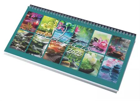 Fekvő asztali naptár, Ikerspirállal összefűzött, 12 színes képpel, színes műbőrrel bevont tartóval. Beosztás: hetiPapír: fehér, meditáció képekkelMéret: 32 x 15.5 cm56 laposreklámfelület a tartó hátsó oldalán (320 x 50 mm)