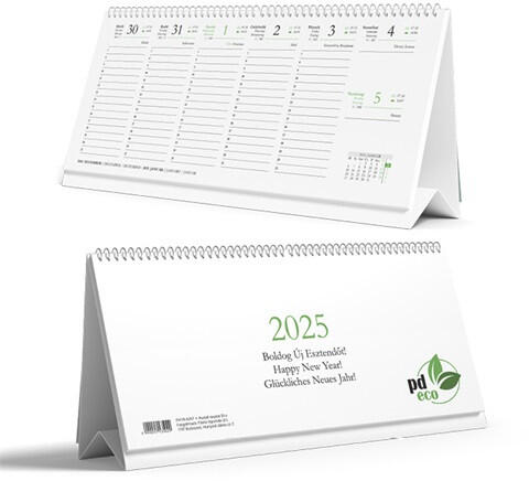 Naptár asztali pd Eco 2025 Méret: 283×135 mm Terjedelem: 60 lap Naptárbeosztás: hétköznap 7–21 órás Papír: 70 g/m2 újrahasznosított ofszet Nyomás: 2+0 szín, szürke-zöld Tábla: fehér karton, 400 g/m2 Kötészet: spirálozott