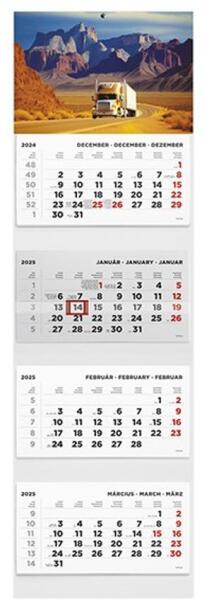 4 tömbből álló 4 havi speditőr falinaptár. A naptár teljes mérete: 315x1065 mm. Reklámfelület: fejkarton: 315x213 mm, tömbök között: 300x35 mm.