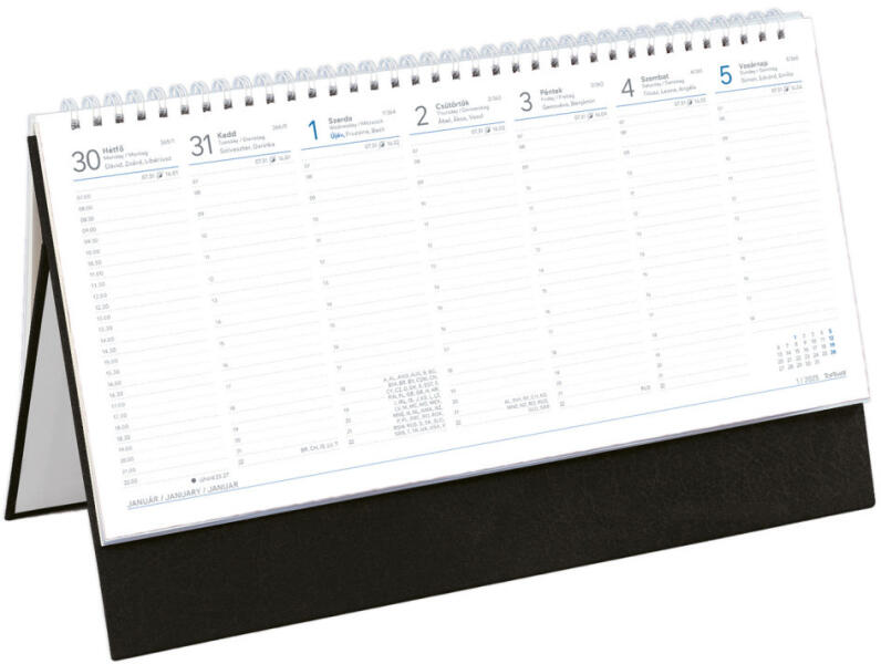 összesítő éves naptár (aktuális + következő) nemzetközi ünnepek, napkelte, napnyugta, holdfázisok jelölése naptárbeosztás: 6.00–22.00, 8.00–18.00 óráig félórás beosztással teljes szombat-vasárnap egyoldalas nyomás, szürke-kék színnel Tömbméret: 325 x 155 mm 54 lapos