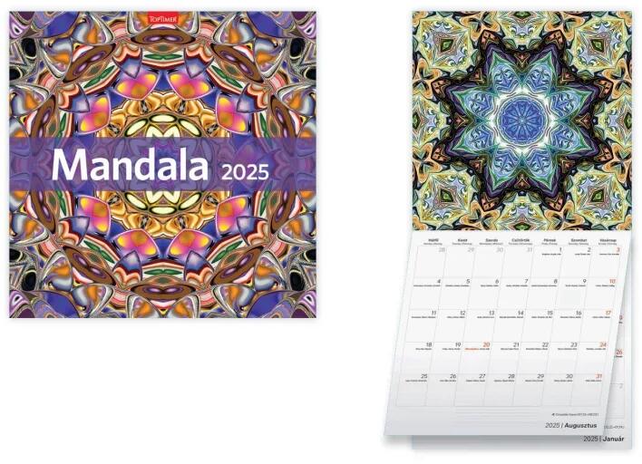 TopTimer Falinaptár 2025, T098 MANDALA Mandala falinaptár - 2025 Meditációra és relaxációra ösztönző, színes mandalákat tartalmazó naptár Jellemzők: Magyar naptárháló, névnapok 14 lapos tűzött kivitel Papír: 130 g Lapméret: 290 × 290 mm Kiterített méret: 290 × 580 mm