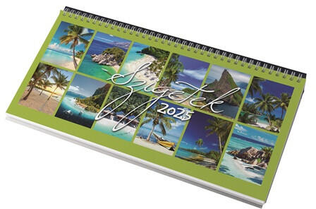 Realsystem 2025 Sziget 7971-01 képes fekete asztali naptár Ikerspirállal összefűzött naptárak heti beosztással, 12 színes képpel, színes műbőrrel borított fekvő tartóval. 56 lapos, spirálozott, 70g-os fehér papírral. Egyediesítés: présfólia, vakdombor, szita. Méret: 320x155 mm, reklámfelület a tartó hátsó oldalán 320x50mm.