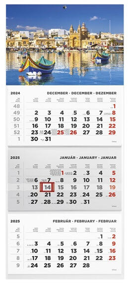 Kalendart 2025 T074 3 tömb Város mintás speditőrnaptár A speditőr falinaptárak a fejrészben standard képpel vagy fehér nyomatlan fejkartonnal kerülnek forgalomba. A naptárháló 3 nyelvű, magyar és nemzetközi ünnepek jelölésével, 3 hónapos, háromtömbös kialakítással, csúszkával. Egyediesítés: az ajánlott kép helyett, a cégre jellemző képpel vagy emblémával is k