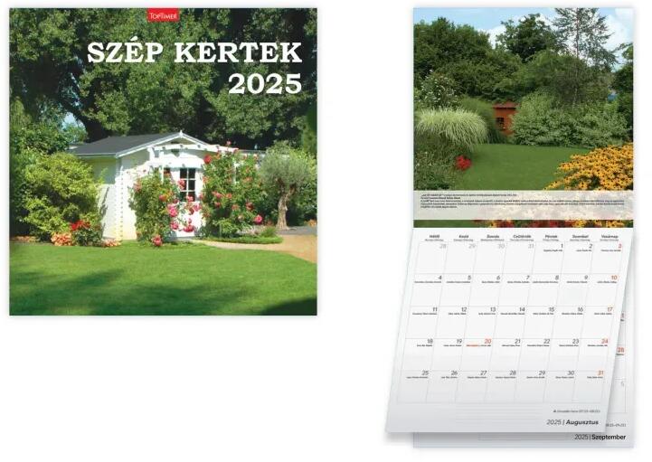TopTimer Falinaptár 2025, T098 SZÉP KERTEKSzép kertek, képes lemeznaptár 2025Jellemzők: Magyar naptárháló, névnapokkalLemeznaptár (kihajtható)14 lapos tűzött kivitel12 hónaposPapír: 140 gLapméret: 290x290 mmKiterített méret: 290x580 mm