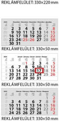 330x880 mm lapok 70 g fehér ofszet papírból nyomás színe: szürke-vörös magyar-angol-német nyelvű naptárháló magyar ünnepek kiemelés nemzetközi ünnepek jelölése (45 ország) reklámfelület anyaga triplex karton reklámfelület a tömbök között: 330x50 mm