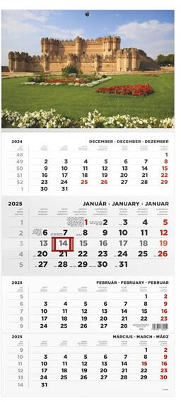 Kalendart 2025 T079 4 havi Kastély mintás speditőrnaptár A speditőr falinaptárak a fejrészben standard képpel vagy fehér nyomatlan fejkartonnal kerülnek forgalomba. A naptárháló 3 nyelvű, magyar és nemzetközi ünnepek jelölésével, 4 hónapos egytömbös kialakítással, csúszkával. Egyediesítés: az ajánlott kép helyett, a cégre jellemző képpel vagy emblémával is kérh