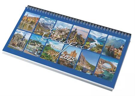 Fekvő asztali naptár, Ikerspirállal összefűzött, 12 színes képpel, fekete műbőr tartóval. Beosztás: hetiPapír: fehér, Európa képekkelMéret: 32 x 15.5 cm56 laposreklámfelület a tartó hátsó oldalán (320 x 50 mm)