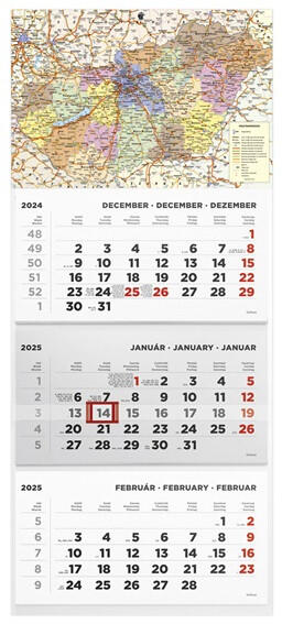Kalendart 2025 T074 3 tömb Magyarország térkép speditőrnaptár A speditőr falinaptárak a fejrészben standard képpel vagy fehér nyomatlan fejkartonnal kerülnek forgalomba. A naptárháló 3 nyelvű, magyar és nemzetközi ünnepek jelölésével, 3 hónapos, háromtömbös kialakítással, csúszkával. Egyediesítés: az ajánlott kép helyett, a cégre jellemző képpel vagy emblémáv