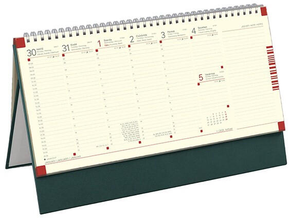 Realsystem 2025 7931-01 fehér papíros fekvő fekete asztali naptár Ikerspirállal összefűzött fekvő naptárak heti beosztással, színes műbőrrel borított tartóval. 56 lapos, spirálozott, 70g-os fehér papírral. Egyediesítés: présfólia, vakdombor, szita. Méret: 320x155 mm, reklámfelület a tartó hátsó oldalán 320x50mm.
