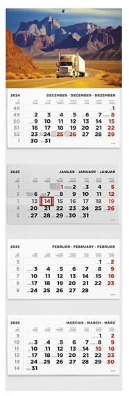 Kalendart 2025 T073 4 tömb Kamion mintás speditőrnaptár A speditőr falinaptárak a fejrészben standard képpel vagy fehér nyomatlan fejkartonnal kerülnek forgalomba. A naptárháló 3 nyelvű, magyar és nemzetközi ünnepek jelölésével, 4 hónapos, négytömbös kialakítással, csúszkával. Egyediesítés: az ajánlott kép helyett, a cégre jellemző képpel vagy emblémával is ké