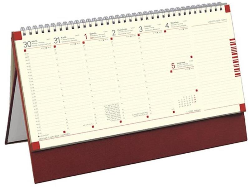 Finoman struktúrált, bőrhatású anyag felhasználásával, enyhén kontrasztos varással készült borító. A kerekített sarkok tovább erősítik az eleganciát. -matt, bőrhatású borító -időbeosztás: félórás, 8-20.00 h -lapok 70 g/m2, chamois papírból -szürke-vörös nyomat -jelzőszalaggal -sarokperforációval -Budapest és Magyarország térképpel -havi összesített naptá