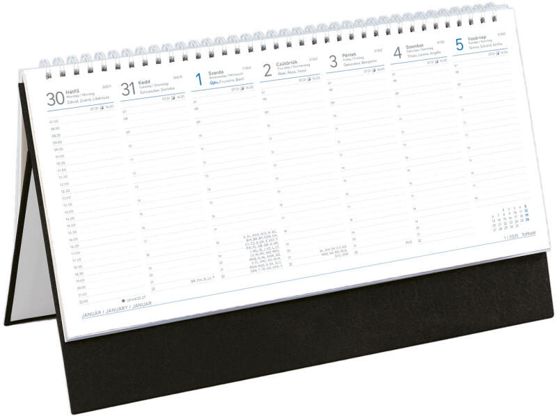 Realsystem 2025 7942-11 fekvő sárga papíros blokktömbös fekete asztali naptár Ikerspirállal összefűzött fekvő naptárak heti beosztással, színes műbőrrel borított tartóval. 56 lapos, blokktömbös, spirálozott, 70g-os chamois papírral. Egyediesítés: présfólia, vakdombor, szita. Méret: 320x155 mm, reklámfelület a tartó hátsó oldalán 320x50mm.