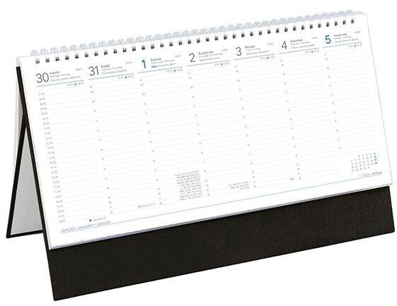 Műbőr táblával készült, fehér tömbös, álló asztali naptár. Egyoldalas nyomás, teljes szombat-vasárnap, heti beosztás, 54 lap, összesítő éves naptár (aktuális+következő). Szitázással, présfólia- és vaknyomással emblémázható. Tömbméret: 325x155 mm, reklámfelület mérete: 330x40 mm