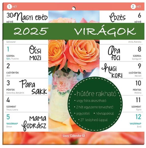 22x22 cm méretű, képes, hűtőmágnessel ellátott kétheti bontású tervező naptár, (falra is akasztható), ünnepekkel, névnapokkal, jegyzetekkel, 29 oldal, 220x220 mm
