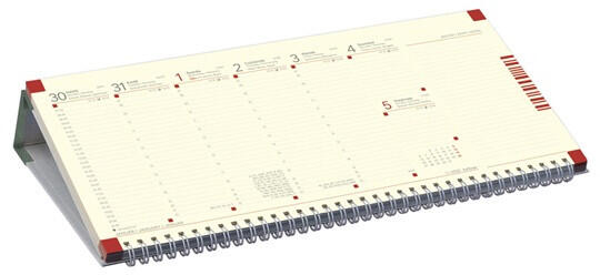 Műbőr táblával készült, fehér tömbös, álló asztali naptár. Szitázással, présfólia- és vaknyomással emblémázható. Naptárbeosztás: 6-22 óráig, 8-18 óráig félórás beosztással. Reklámfelület: 330x40 mm.