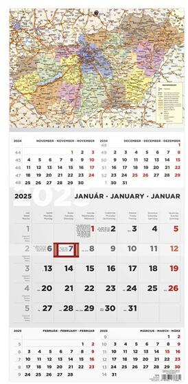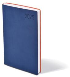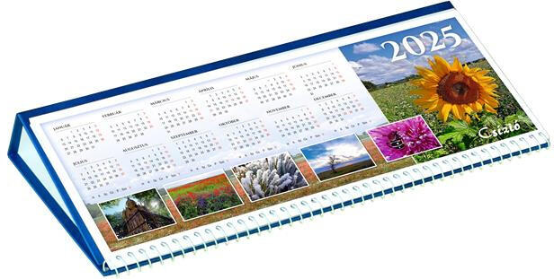 Realsystem 2025 Magyarország 7991-04 képes kék asztali naptár Ikerspirállal összefűzött naptárak heti beosztással, 12 színes képpel, színes műbőrrel borított fekvő tartóval. 56 lapos, spirálozott, 70g-os fehér papírral. Egyediesítés: présfólia, vakdombor, szita. Méret: 320x155 mm, reklámfelület a tartó hátsó oldalán 320x50mm.