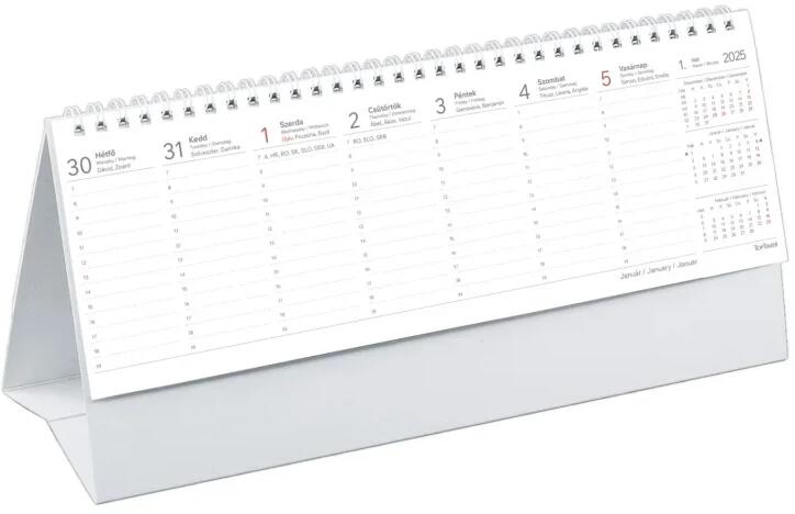 TopTimer T065 Álló asztali naptár 2025, Papír táblásPapírtáblás fehér tömbös, álló asztali naptár T065 Naptárbeosztás: óránként, 7-19 óráig Méret: 290x100 mm Összesítő éves naptár (aktuális + következő) Nemzetközi ünnepek, 3 havi összesítő Névnapok Teljes szombat-vasárnap Kétoldalas nyomás, szürke-vörös színnelSzitanyomással és présfólianyomással em