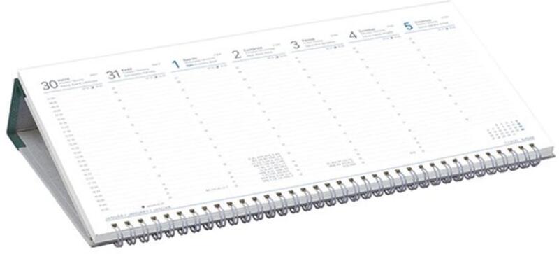 Műbőr táblával készült, fehér tömbös, fekvő asztali naptár. Szitázással, présfólia- és vaknyomással emblémázható. Naptárbeosztás: 6-22 óráig, 8-18 óráig félórás beosztással. Reklámfelület: 330x50 mm.