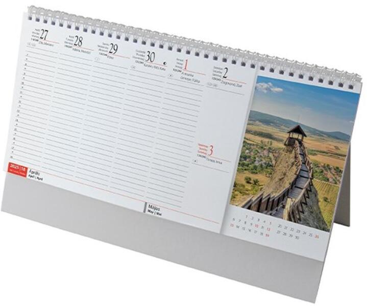 Ikerspirállal összetűzött naptár heti beosztással, 12 színes képpel, papírtáblás, álló asztali naptár. Naptárbeosztás: heti. Reklámfelület: 320x40 mm
