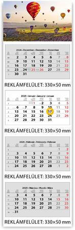 A Naptár, speditőr, négy hónapos, négy tömbös, DAYLINER, vegyes fejrész (NSPED4VI25) 330x1100 mm lapok 70 g fehér ofszet papírból nyomás színe: szürke-vörös magyar-angol-német nyelvű naptárháló magyar ünnepek kiemelés nemzetközi ünnepek jelölése (45 ország) reklámfelület anyaga triplex karton reklámfelület a tömbök között: 330x50 mm vegyes fejrésszel, a minta n