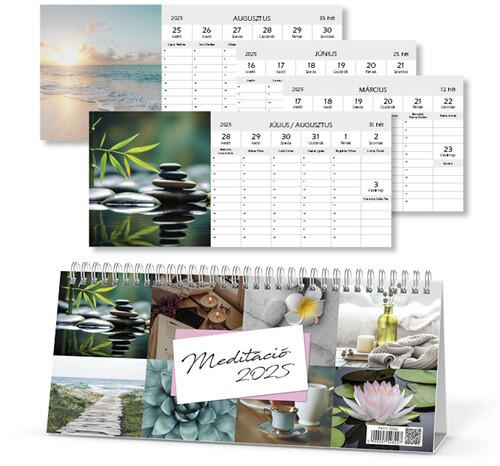 Naptár Csonka asztali pd Meditáció 2025 Formátum: álló Méret: 285×128 mm Terjedelem: 53 lap Naptárbeosztás: heti beosztás, 8–18 óra közötti időbeosztással, magyar név- és ünnepnapok feltüntetésével Papír: 90 g/m2 műnyomó Nyomás: 4+0 szín Tábla: fehér karton, 400 g/m2 Kötészet: spirálozott