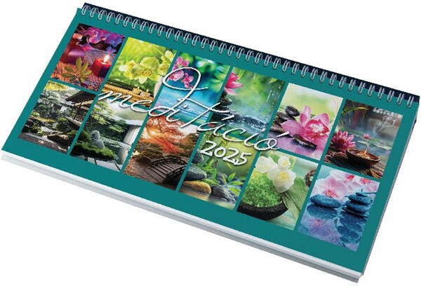 Realsystem 2025 Meditáció 7941-01 képes fekete asztali naptár Ikerspirállal összefűzött naptárak heti beosztással, 12 színes képpel, színes műbőrrel borított fekvő tartóval. 56 lapos, spirálozott, 70g-os fehér papírral. Egyediesítés: présfólia, vakdombor, szita. Méret: 320x155 mm, reklámfelület a tartó hátsó oldalán 320x50mm.
