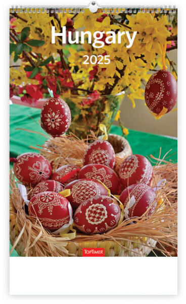 B4 méretű (álló formátum), spirálozott képes falinaptár, 12 hónap, ünnepekkel, névnapokkal, fém akasztóval, 235x330 mm