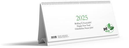 PD Eco 2025 asztali naptár Eco asztali naptár spirálozott, 60 lap terjedelem, hétköznap 7-21 órás beosztás, 70 g/m2 újrahasznosított ofszet papír, 2+0 színnyomás szürke-zöld, tábla: fehér karton, 400 g/m2; méret: 283×135 mm