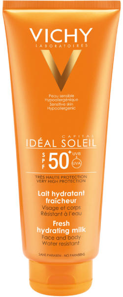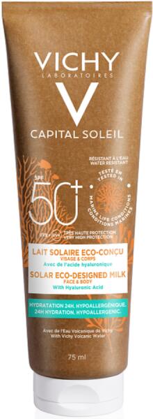 VICHY CAPITAL SOLEIL környezettudatosan tervezett naptej. Hialuronsavval és Vichy Termálvízzel. 24H Hidratálás. Hipoallergén. SPF 50+ Nagyon magas védelem. Felhasználási javaslat: A készítményt közvetlenül napozás előtt vigye fel bőrére. Napozás közben, különösen fürdés, izzadás vagy törülközés után gyakran és bőségesen vigye fel újra a készítményt, hogy foly