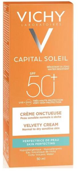 Bársonyos napvédő krém SPF 50+:UVA+UVB védelem. Normál vagy száraz bőrre. Innováció: UV-védelem Mexoryl® SX & XL fényszűrővel. Véd a napsugárzás káros hatásai és a korai bőröregedés ellen. Az arcbőr simábbnak érződik és ragyogóbb lesz. Hidratáló formula, puha, bársonyos hatással. VízállóParaben-mentesHipoallergénFig yelem: A túlzásba vitt napozás veszé