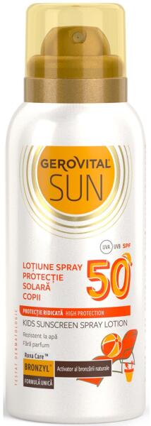Gerovital Sun Napvédő spray A Gerovital Sun Napvédő Spray, SPF 50 magas védelmet biztosít a gyermekek számára a szabadban töltött idő során. A testápoló magas szintű védelmet biztosít a gyermekek érzékeny bőrének a leégés ellen, elsősorban az UVB spektrum tartományából származó sugárzás miatt. Ugyanakkor megakadályozza az UVA sugárzás hosszú távú negatív bőrh