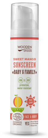 Bőr- és környezetbarát naptej az egész családnak: jól bevált naptejünk a lédús mangó illatával! Nagyon finom kellemes illat, nem erős. A Wooden Spoon 50-es faktorszámú bio fizikai fényvédő ellenőrzött organikus vajakkal, természetes E-vitaminnal, nem-nano cink-oxiddal, az ellenállhatatlan, lédús mangó illatával. Világújdonság! Európában elsőként láthatatlan cink-