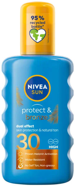 Selymes napolaj, amely ápolja a bőrt a természetes, hosszan tartó barnaság elősegítésére, önbarnító nélkül: NIVEA SUN Protect & Bronze Barnulást Támogató Napozó Spray FF30. Az ápoló, olajos formulája melanin termelését elősegítő, növényi hatóanyaggal támogatja a bőr természetes barnulását. Bőrgyógyászatilag tesztelt összetétele az UVA és UVB sugarak elle
