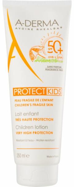 A-Derma Protect Kids, 250 ml, Napvédő kozmetikumok gyermekeknek gyermekeknek, A gyermekek bőre rendkívül érzékeny a napsugarakra, ezért fontos, hogy kellően hatékony és megbízható védelmet biztosítsunk számukra. A minőségi A-Derma Protect Kids fényvédő gondoskodik erről. A hatékony UV-szűrők kombinációja megakadályozza a káros napfény okozta irritációt, leégést va
