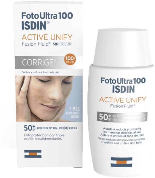 ISDIN Fotoultra Active Unify 100+ Hármas hatású depigmentációs folyadék fényvédelemmel, SPF50+, 50 ml Miért a FotoUltra 100 ISDIN Active Unify? A FotoUltra 100 ISDIN Active Unify egy depigmentációs hatású folyadék, amely megnyitja és kiegyenlíti a bőr tónusát. Segít csökkenteni a napfoltokat a DP3-Unify komplexnek köszönhetően: bizonyítottan szabályozza a melanin kiválas