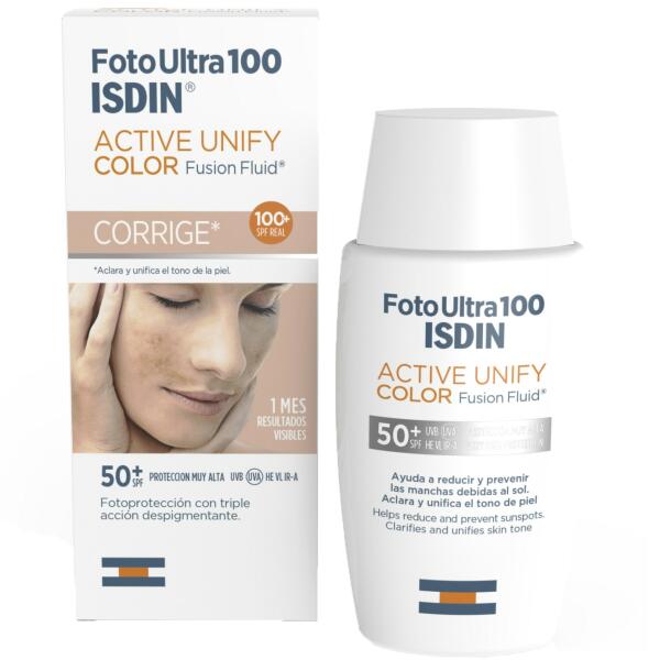 ISDIN Fotoultra Active Unify Color 100+ Hármas depigmentációs hatású színezett fényvédő krém, SPF50+, 50 ml A FotoUltra 100 ISDIN Activ Unify egy depigmentációs hatású folyadék, amely helyreállítja a bőr ragyogását és kiegyenlíti az arcszínt. Segít csökkenteni a napfoltokat a DP3-Unify komplexnek köszönhetően: bizonyítottan szabályozza a melanin kiválasztását. Két