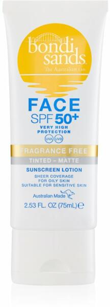 Érezd jól magad egy napsütötte napon Bondi Sands módra az illatanyagmentes SPF 50+ Matt Színezett Arckrémünkkel! Enyhe fedésű színezett formulája UVA és UVB védelmet biztosít, nem hagy olajos érzetet, így tökéletes zsíros bőrre. Önmagában vagy smink alá is használhatod. Bőrgyógyászatilag tesztelt. Érzékeny bőrre is alkalmas. Nem komedogén, nem tömíti el a pórusok