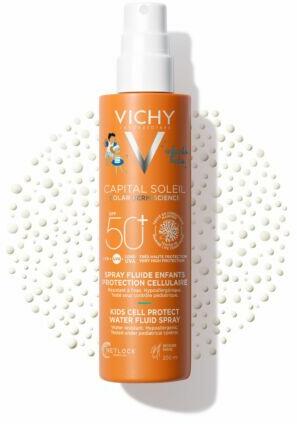 VICHY Capital Soleil VIZES FLUID SPRAY GYEREKEKNEK SPF 50+. NAGYON MAGAS VÉDELEM. Gyermekek érzékeny bőrére. Probiotikus frakciókkal és vulkanikus eredetű Vichy Termálvízzel. Erősíti a bőr védőrétegét. Netlock technológia: extra vékony filmréteg, amely rögzíti az UVB-, UVA- és hosszú hullámú UVA-sugárzás elleni széles spektrumú szűrőket. Extra könnyű, láthatatlan