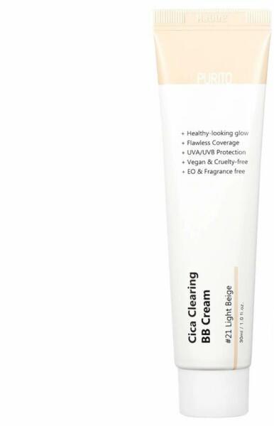 A Purito Cica Clearing BB Cream 21 Light Beige - Világos Bézs cica kivonatokat tartalmaz, amelyek erősítik a bőrvédőréteget és extra adag nedvességet biztosítanak. Ez egy mindenre kiterjedő termék, amely véd az UVA / UVB sugarak ellen, és egyenletessé és természetessé teszi a bőrt. Tökéletes, mert nem csak smink, hanem a benne lévő cica kivonatnak köszönhetően elegendő