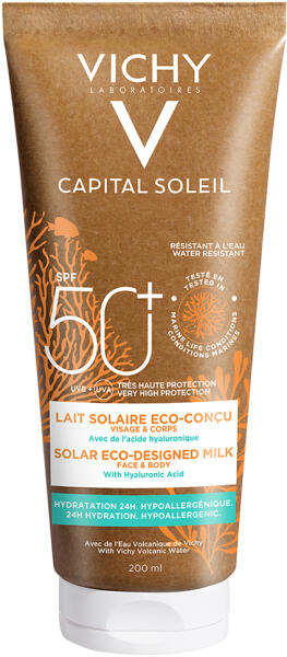 VICHY CAPITAL SOLEIL környezettudatosan tervezett naptej. Hialuronsavval és Vichy Termálvízzel. 24H Hidratálás. Hipoallergén. SPF 50+ Nagyon magas védelem. Használata: A készítményt közvetlenül napozás előtt vigye fel bőrére. Napozás közben, különösen