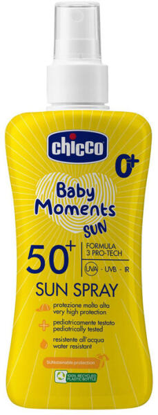 Napozó spray nagyon magas, SPF 50+ védelemmel, kifejezetten érzékeny gyermekbőrre fejlesztve. Védelmet nyújt mindenféle napfény ellen: UVA, UVB és infravörös (IR) sugarak ellen. Jellemzők: egyszerű alkalmazás spray formájában vízálló könnyű, nem zsíros szerkezet nem tartalmaz kémiai UV szűrőket nem tartalmaz színezékeket, alkoholt, parabént, parfümöket hipoallergén