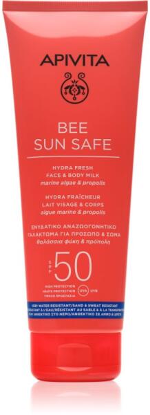 Apivita Bee Sun Safe Hydra Fresh Milk SPF50, 200 ml, Napsugárzás elleni védekezés nőknek, Védje bőrét a napsugárzás okozta idő előtti öregedéstől és egyéb károsodásoktól. Az arc finom bőre sokkal érzékenyebb, mint a test többi részén lévő bőr, és egész évben ki van téve a napsugaraknak – ezért fontos, hogy nem becsülje alá a védelmét. A kiváló Apivita Bee